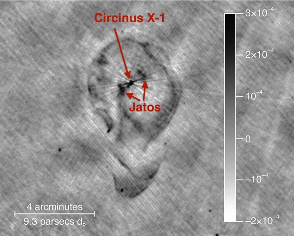 O remanescente de supernova que rodeia a sistema binário Circinus X-1, observado em ondas de rádio. São visíveis também dois jacto de emitidos pela estrela de neutrões. Crédito: University of Wisconsin-Madison/S. Heinz et al..