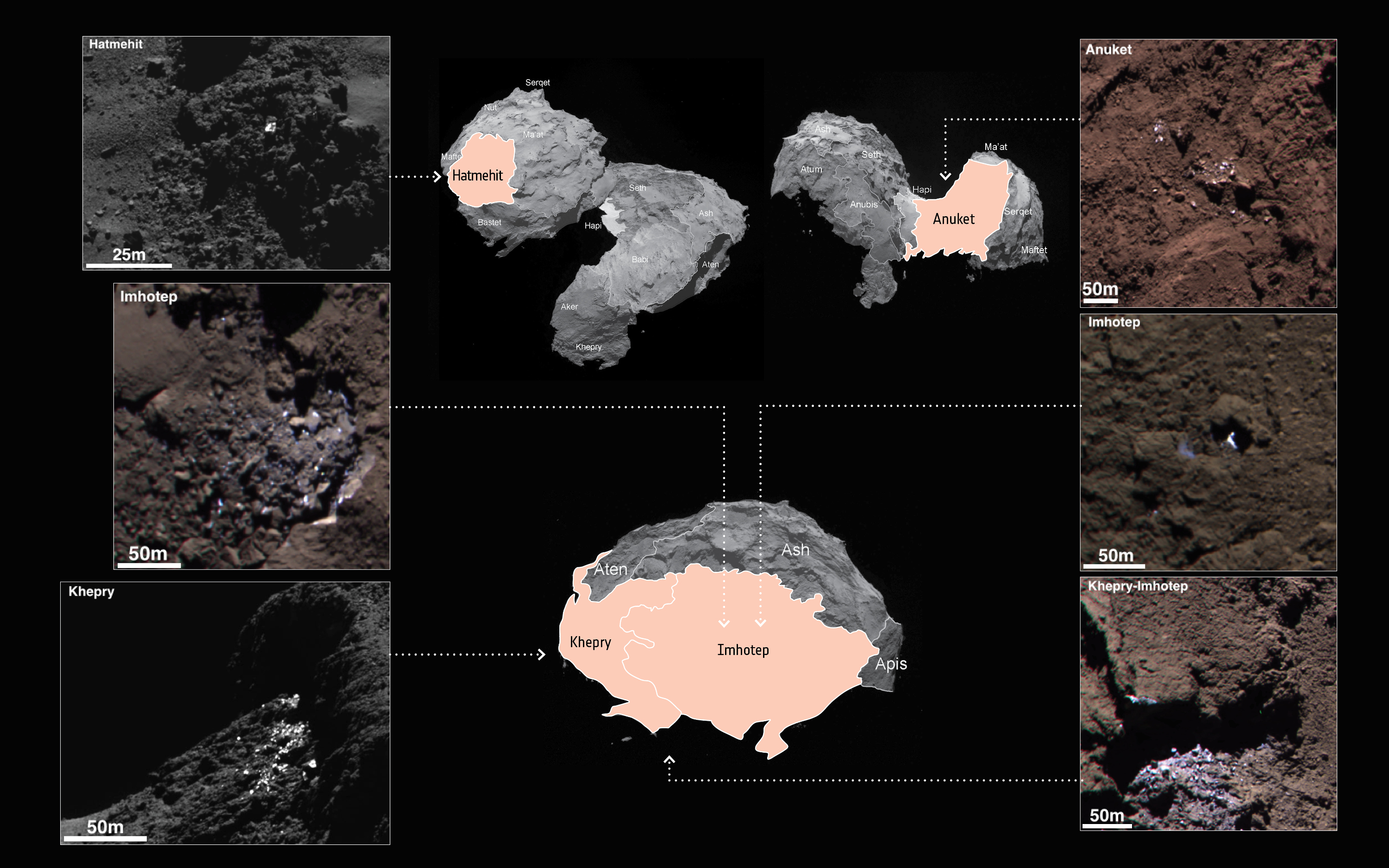 Imagens em cores falsas mostrando manchas brilhantes nas regiões de Anuket, Imhotep e Khepry-Imhotep. As imagens foram obtidas pelo sistema de imagem OSIRIS da sonda Rosetta, em setembro de 2014, a distâncias entre os 30 e os 40 km do centro do núcleo de 67P.