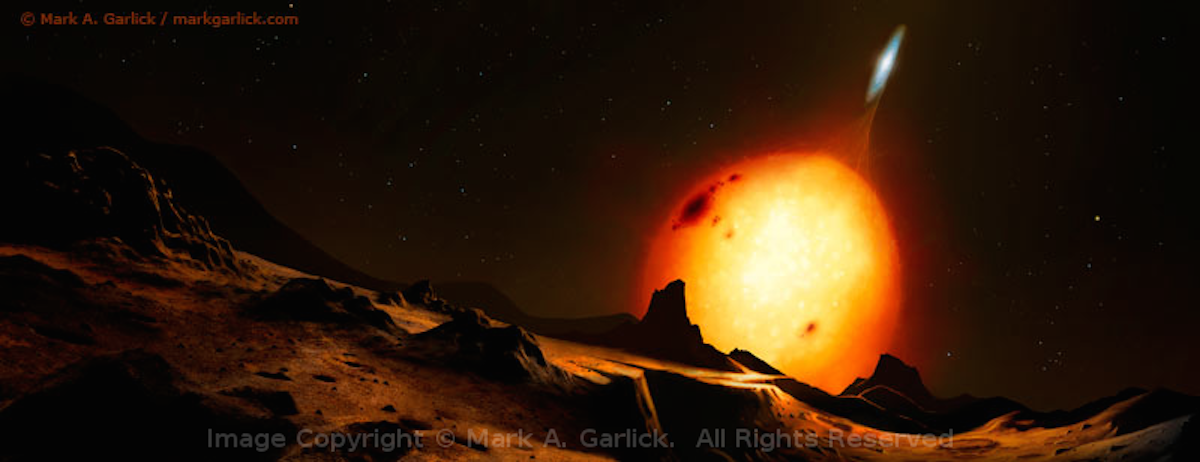 Representação artística de um sistema que poderia bem ser o V404 Cygni observado a partir de um hipotético planeta circumbinário. Crédito: Mark A. Garlick.