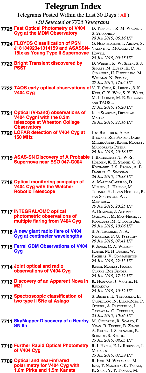 O frenesim provocado pelo evento na comunidade astronómica é bem evidente neste snapshot da página The Astronomer’s Telegram, utilizada pela comunidade para divulgar rapidamente observações. Das 17 entradas entre os dias 25 e 28 de Junho, 11 dizem respeito a observações de V404 Cygni em várias regiões do espectro electromagnético. Esta vigilância contínua da erupção com diferentes instrumentos está a produzir dados valiosíssimos para os astrónomos, que permitirão, eventualmente, compreender a física dos LMXBs.