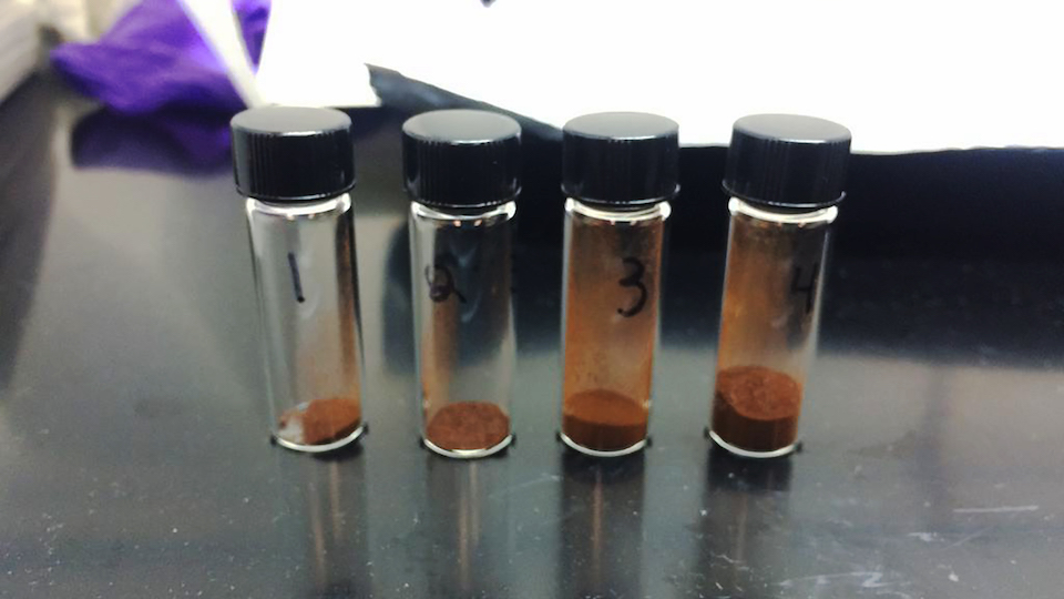 Cientistas da Johns Hopkins University produziram em laboratório tolinas que poderão conferir a Plutão a cor laranja-acastanhada visível nas imagens. Crédito: Chao He, Xinting Yu, Sydney Riemer, and Sarah Hörst, Johns Hopkins University.