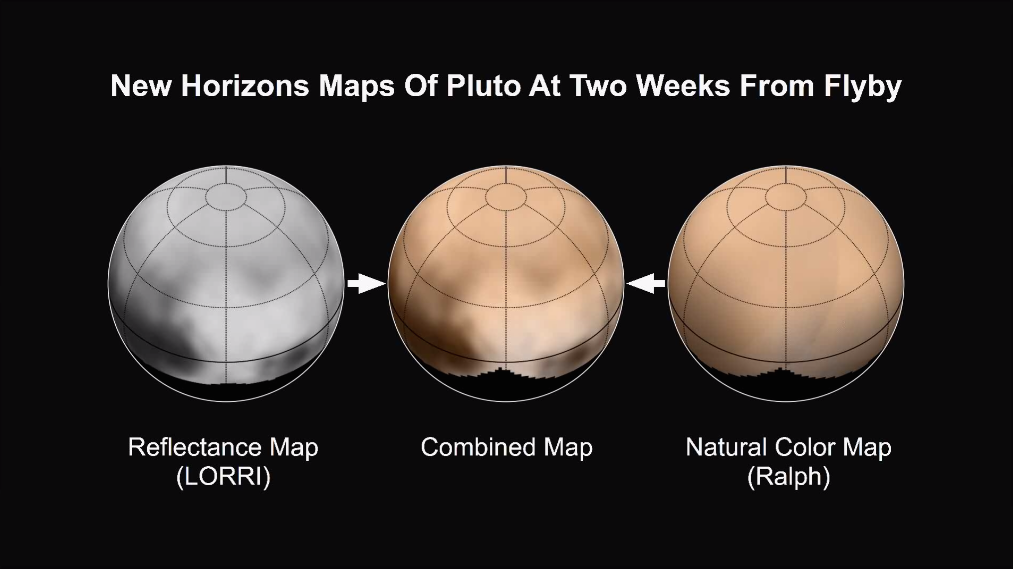 Há uns dias a equipa da missão New Horizons disponibilizou o primeiro mapa a cores de Plutão. O mapa foi obtido combinando imagens da câmara LORRI com imagens obtidas pela câmara Ralph. As imagens da Ralph, apesar da sua resolução mais baixa, mostram Plutão em diferentes comprimentos de onda, permitindo a reconstrução da cor “real” de Plutão.