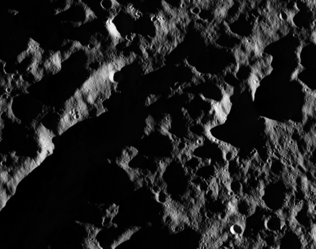 Território acidentado localizado nas proximidades de Argiletum Fossae, na região do polo norte de Dione. Imagem obtida pela câmara de grande angular da sonda Cassini, a 17 de agosto de 2015, a uma altitude de 588 km (resolução: 35 metros por píxel).