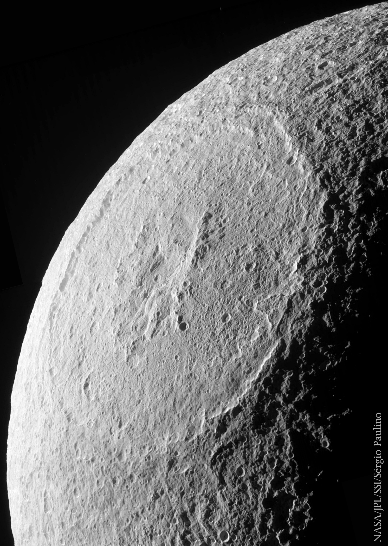Poucas horas depois da sua última visita a Dione, a Cassini sobrevoou a lua Tétis, a uma altitude aproximada de 42 mil quilómetros. Este encontro foi uma oportunidade para a sonda da NASA fotografar o lado ocidental do hemisfério líder de Tétis – uma região que inclui a cratera Odysseus, uma das maiores estruturas de impacto do Sistema Solar.