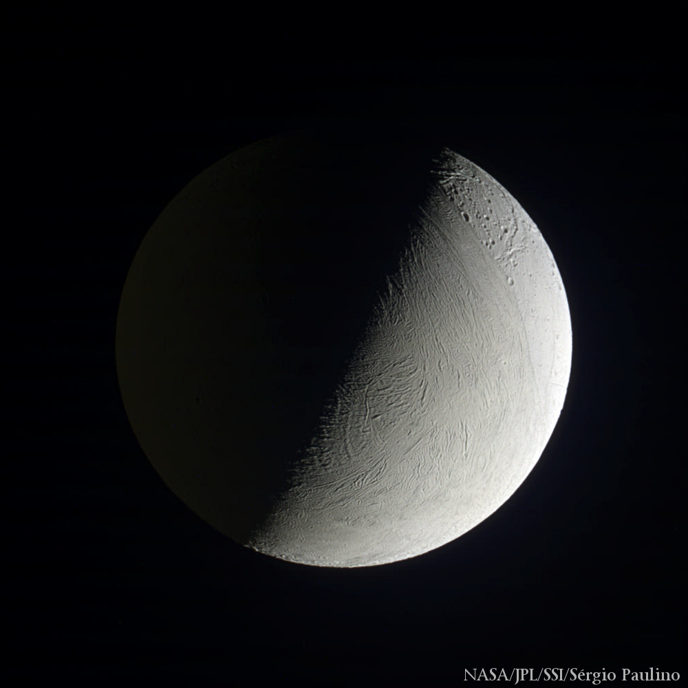 A lua Encélado vista pela sonda Cassini, a 08 de setembro de 2015.Crédito: NASA/JPL/SSI/Sérgio Paulino.