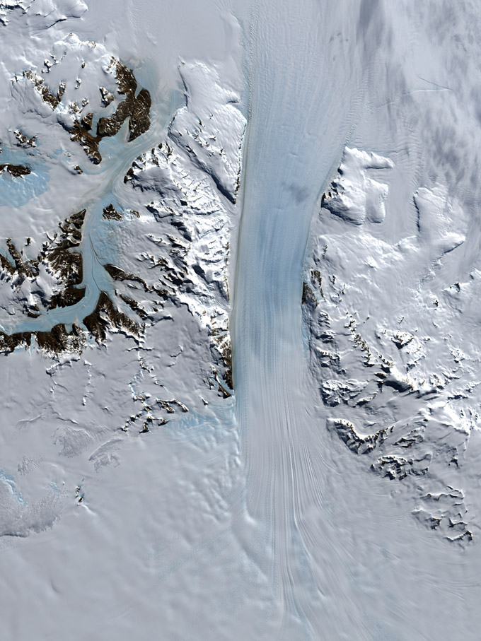 O leitor pode verificar como estas estruturas de Plutão são semelhantes aos glaciares terrestres, observando a imagem seguinte de um glaciar na Antártida.