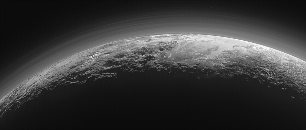Apenas 15 minutos após o ponto de maior aproximação a Plutão, no dia 14 de Julho de 2015, a New Horizons virou-se para trás e a câmara MVIC (Multispectral Visual Imaging Camera) do instrumento Ralph capturou esta imagem incrível da superfície do planeta anão — uma paisagem repleta de montanhas e planícies geladas. A região plana, à direita, é Sputnik Planum e é flanqueada, à esquerda, pelas cordilheiras Norgay Montes (em primeiro plano) e Hillary Montes (mais atrás). As montanhas aqui atingem os 3500 metros de altitude. O contra-luz torna particularmente visível a atmosfera rarefeita de Plutão, que apresenta várias camadas de neblinas. A imagem foi obtida quando a sonda se encontrava a uma distância de 18 mil quilómetros de Plutão e a paisagem abarca 380 quilómetros da sua superfície.