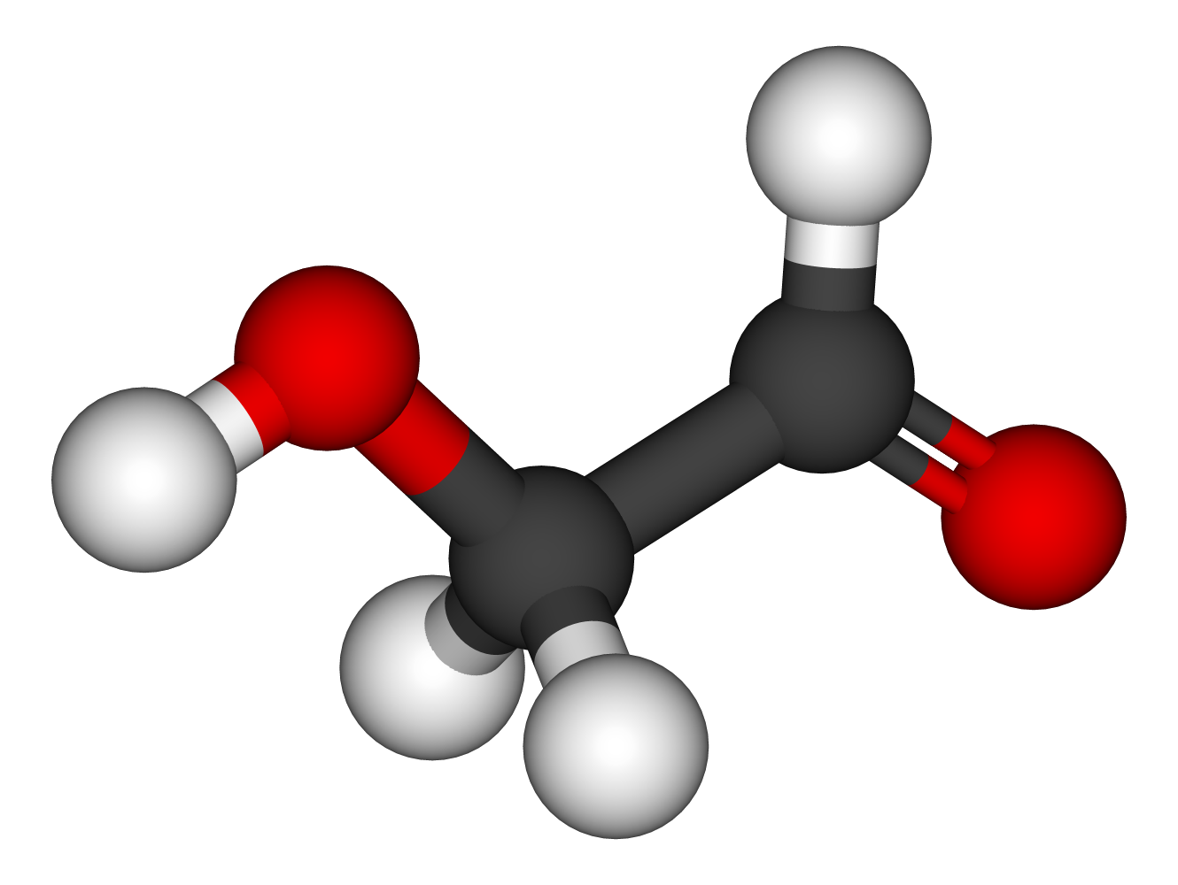 A molécula do glicoaldeído, um açucar simples. As esferas representam os átomos e os segmentos as ligações electrónicas entre os mesmos. As cores identificam o tipo de átomo: hidrogénio (cinza), carbono (preto) e oxigénio (vermelho). Crédito: Wikipedia.