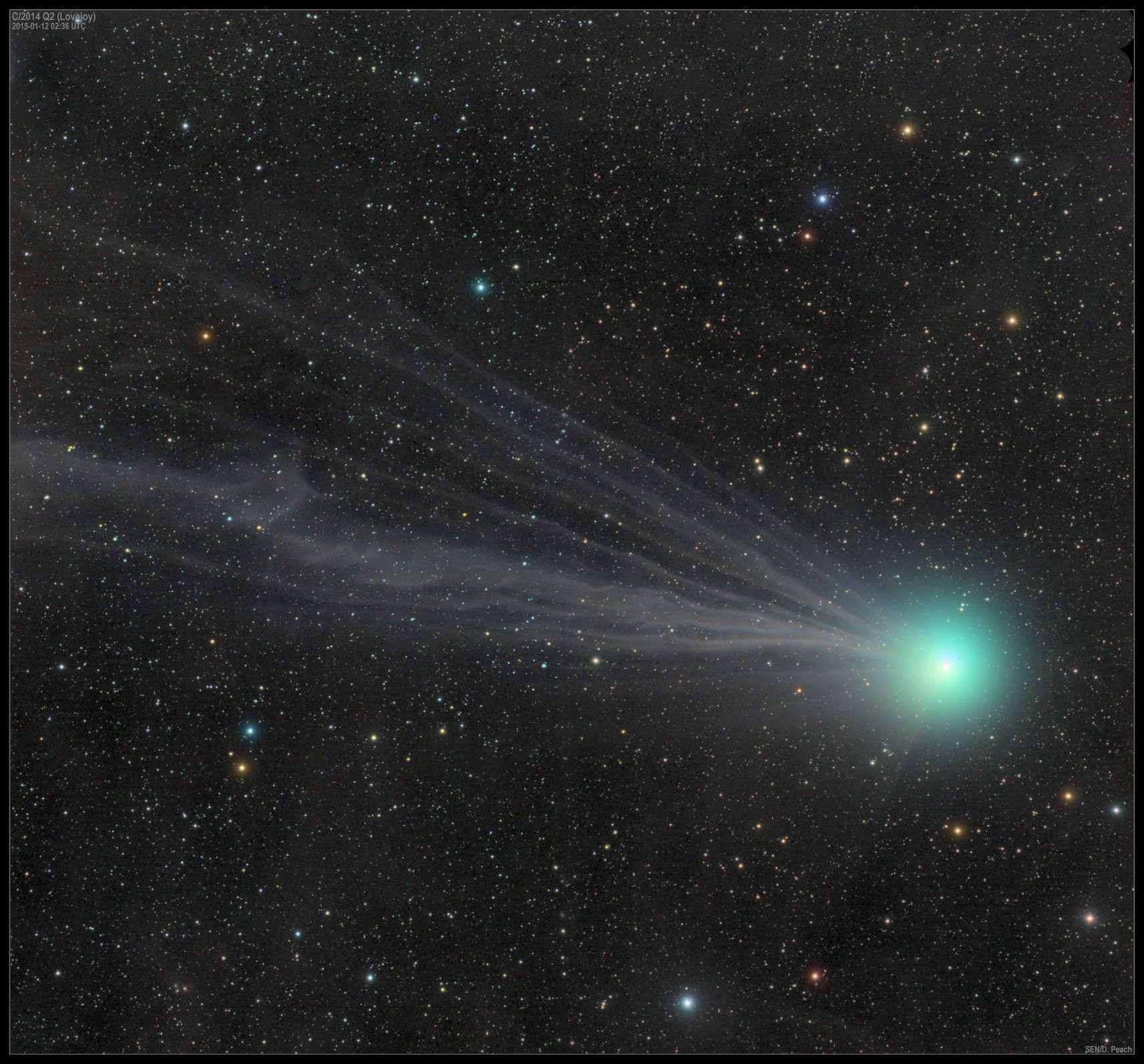 Descoberto em Agosto do ano passado pelo astrónomo amador australiano Terry Lovejoy, o cometa C/2014 Q2 (Lovejoy) proporcionou um belo espectáculo no céu nocturno durante os meses de Dezembro de 2014 e Janeiro deste ano. O cometa foi particularmente activo, tendo desenvolvido uma cauda longa e complexa de gás, apesar da sua órbita não o deixar aproximar muito do Sol — distância mínima de 1.29 unidades astronómicas. Esta característica levou uma equipa de astrónomos a observá-lo em pormenor, em comprimentos de onda sub-milimétricos, com o intuito de estudar a composição do seu gás. Nos dados recolhidos pela equipa foi detectada a assinatura de 21 espécies químicas diferentes, duas delas inéditas para um cometa: o álcool etílico — o mesmo encontrado nas bebidas alcoólicas — e o glicoaldeído — um açúcar muito simples.