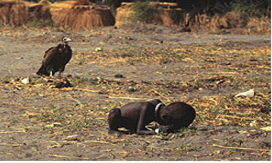 [1] De acordo com o fotojornalista português João Silva, Kevin Carter e ele viajaram ao Sudão com oficiais da Organização das Nações Unidas durante a Operação “Lifeline Sudan” e chegaram ao sudeste do país (atual Sudão do Sul) em 11 de março de 1993. Os oficiais lhes disseram que iriam parar suas atividades por 30 minutos (tempo necessário para distribuir alimentos), de modo que os dois poderiam aproveitaram a oportunidade para observar ao redor e tirar fotos. A ONU começou a distribuir milho e as mulheres da aldeia saíram de suas cabanas de madeira para chegar ao avião. Silva foi à procura de guerrilheiros, enquanto Carter saiu de não mais do que algumas dezenas de metros de perto da aeronave. Ainda de acordo com Silva, Carter estava muito chocado, pois era a primeira vez que ele tinha visto uma situação de fome extrema e que por isso tirou muitas fotografias das crianças famintas no local. Silva também começou a tirar fotos das crianças no chão, como se estivessem chorando, que não foram publicadas. Os pais das crianças estavam ocupados pegando a comida do avião da ONU, de modo que deixaram seus filhos sozinhos por pouco tempo, enquanto recolhiam os alimentos doados. Esta era a situação do menino registrado na foto de Carter. Um abutre então pousou atrás do garoto. Para ter os dois em foco, Carter se aproximou da cena muito lentamente para não assustar a ave e tirou uma foto a aproximadamente 10 metros de distância. Ele então tirou mais algumas fotos antes de espantar o pássaro. Dois fotógrafos espanhóis que estavam na mesma área naquela época, José María Luis Arenzana e Luis Davilla, e que não conheciam a fotografia de Kevin Carter, também tiraram uma foto em situação similar. (fonte: Wikipedia.org)