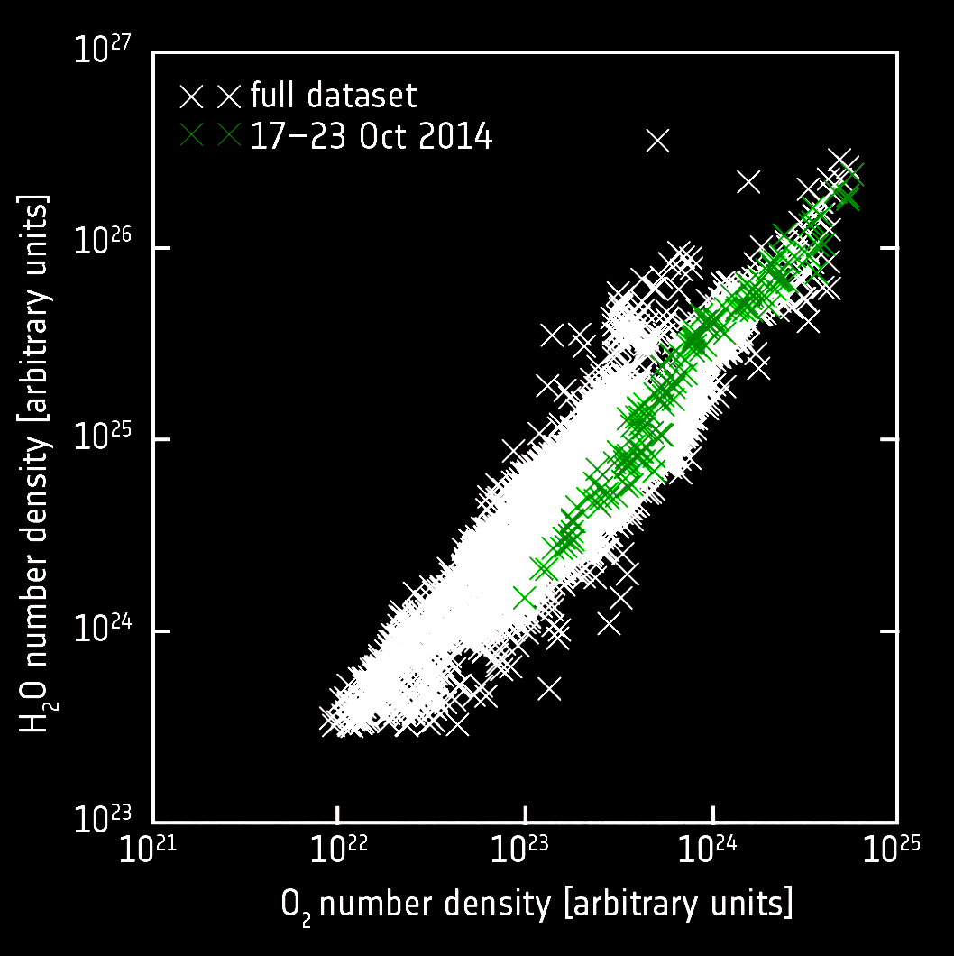 Correlação entre a abundância de O2 e H2O medidas pela Rosetta no período entre setembro de 2014 e março de 2015.