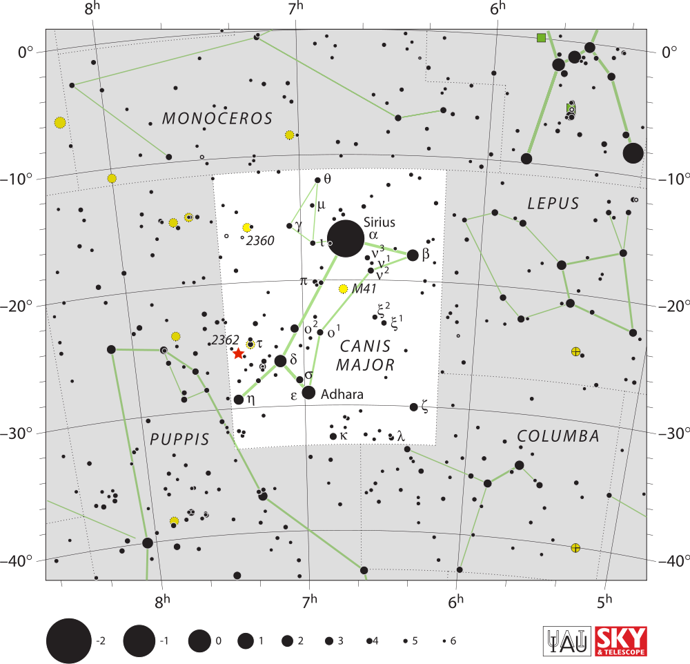 A localização de VY Canis Majoris (estrela vermelha) na constelação do Cão Maior. Crédito: IAU e Sky&Telescope.