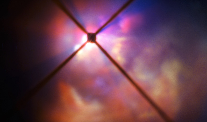A região interior do casulo de gás e poeira que circunda a super-gigante vermelha VY Canis Majoris, observada com o instrumento SPHERE instalado no telescópio Melipal. O padrão em cruz visível na imagem é um suporte para um pequeno disco, visível no centro, que oculta o brilho intenso da estrela e permite observar com detalhe a sua vizinhança. Crédito: ESO.