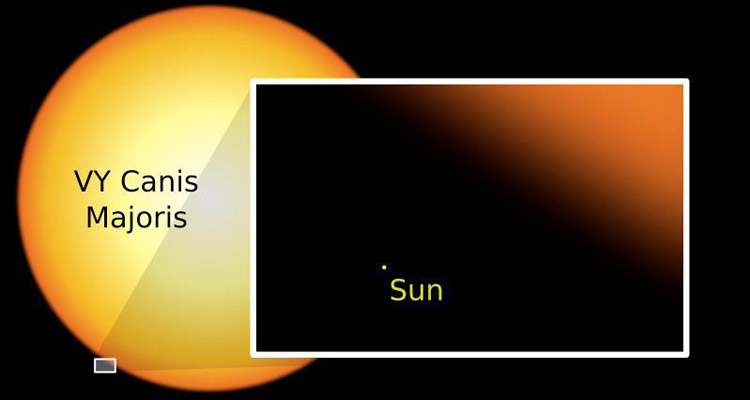 A VY Canis Majoris é uma das super-gigantes vermelhas mais luminosas da Via Láctea, com uma luminosidade total estimada em 300 mil vezes a do Sol, a maior parte emitida no infravermelho. É também enorme, com um raio, medido por interferometria, de 1400 vezes o solar — colocada no lugar do Sol, estender-se-ia quase até à órbita de Saturno! Como o nome indica, a estrela pode ser encontrada na constelação do Cão Maior, proeminente junto ao horizonte sul durante os meses de Inverno à latitude de Portugal.