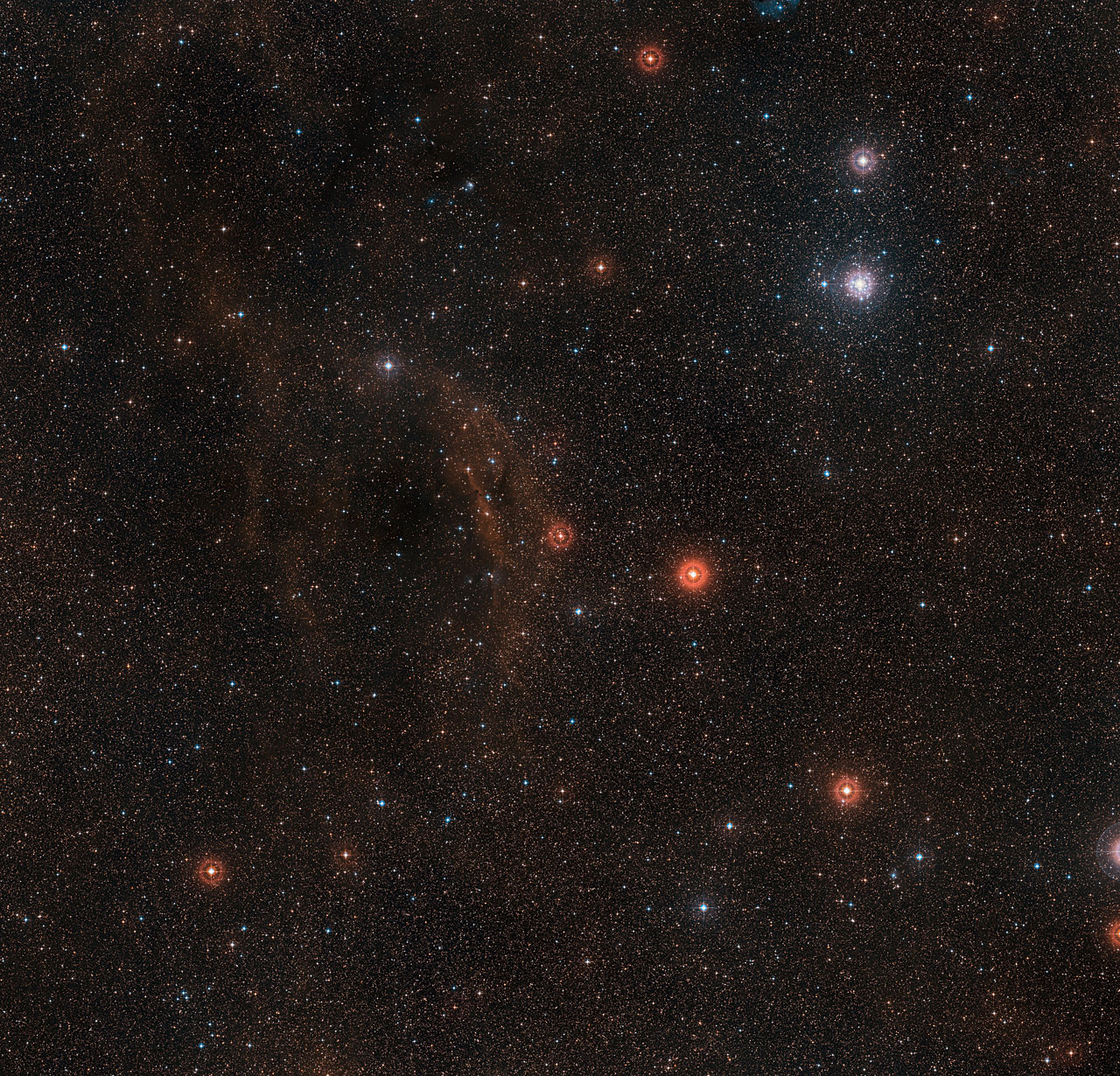 A VY Canis Majoris (estrela vermelha no centro da imagem, junto ao bordo da nebulosidade) e τ Canis Majoris e o enxame NCG2362 que a rodeia (estrela branca mais brilhante à direita, em cima, e pequenas estrelas brancas azuladas que a rodeiam como abelhas numa colmeia. A estrela branca brilhante por cima de τ Canis Majoris é 29 Canis Majoris, um sistema binário em que ambas as componentes são estrelas super-gigantes azuis. Crédito: ESO Digitized Sky Survey 2 e Davide De Martin.