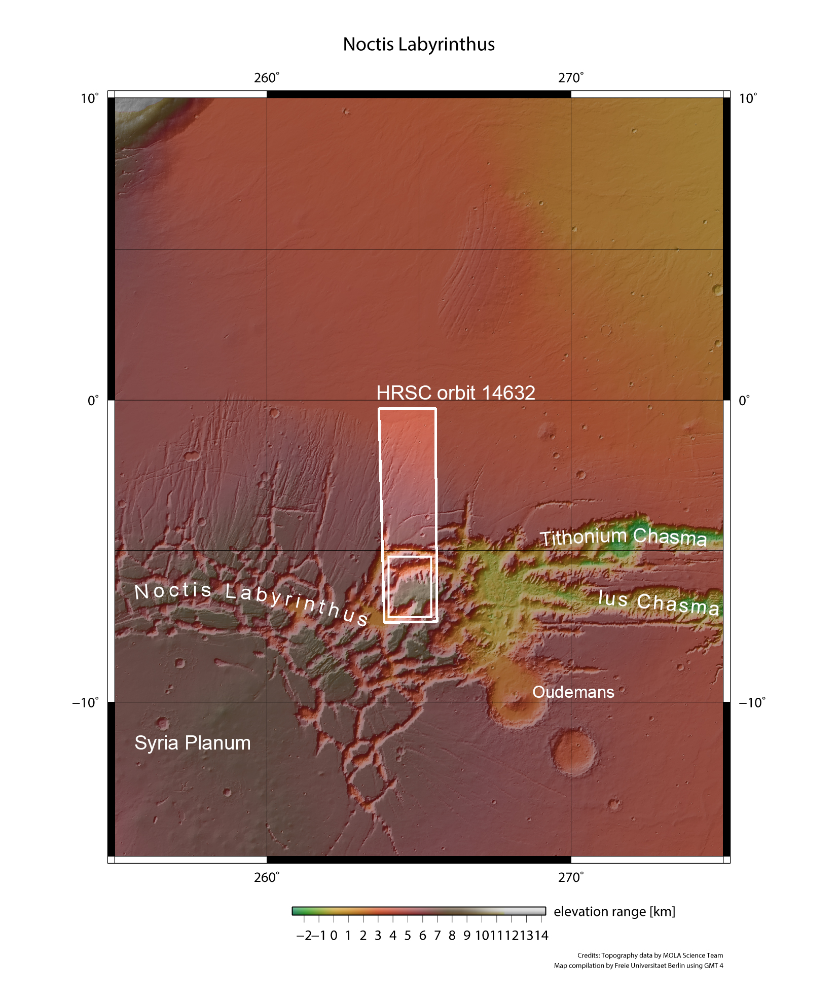 A imagem de cima mostra um pequeno segmento de um vasto sistema de planaltos e vales profundos conhecido por Noctis Labyrinthus. Localizada no extremo ocidental de Valles Marineris, esta região faz parte de uma complexa estrutura em forma de cúpula com mais de 2000 km de diâmetro, que inclui grande parte de Syria Planum, um extenso planalto que se eleva cerca de 6 a 8 km acima do datum geodésico de Marte.