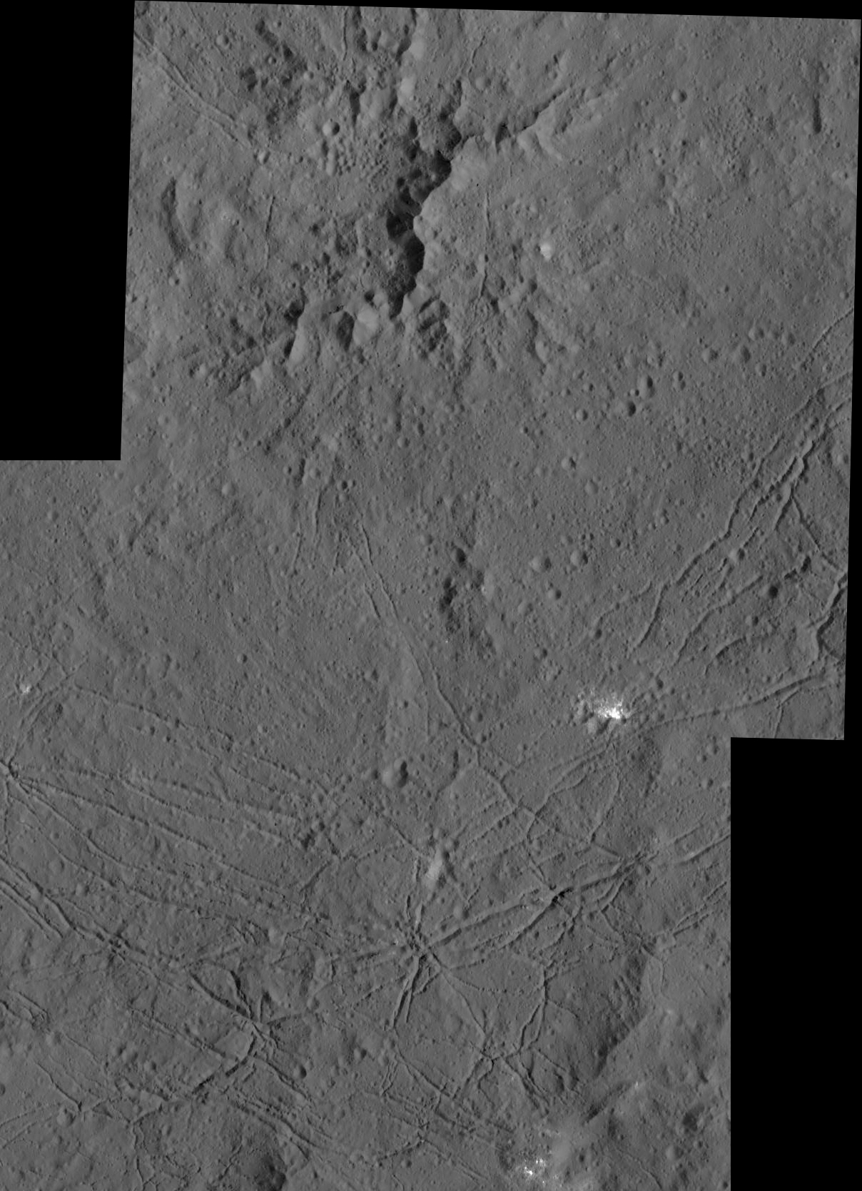 Dantu é uma cratera com cerca de 124 km de diâmetro localizada a norte da bacia de Kerwan, na superfície de Ceres. Na imagem de cima podemos ver numerosas fraturas rasgando o terreno rochoso entre a orla da cratera e o complexo de picos centrais (visível a norte).