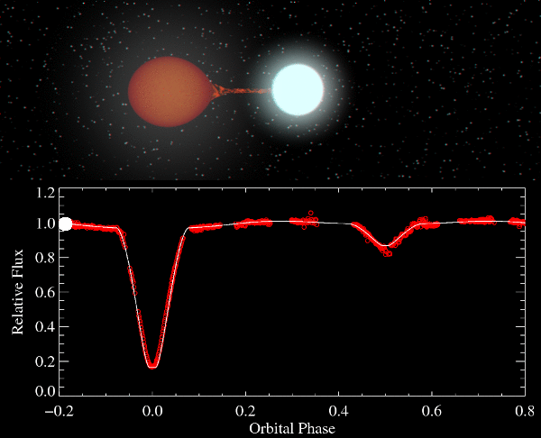 Um sistema binário semelhante a Algol. Note-se o efeito dos eclipses na curva de luz do sistema. O filamento entre as duas estrelas é material da estrela laranja, a secundária, que está a ser capturado pela estrela branca, a primária.