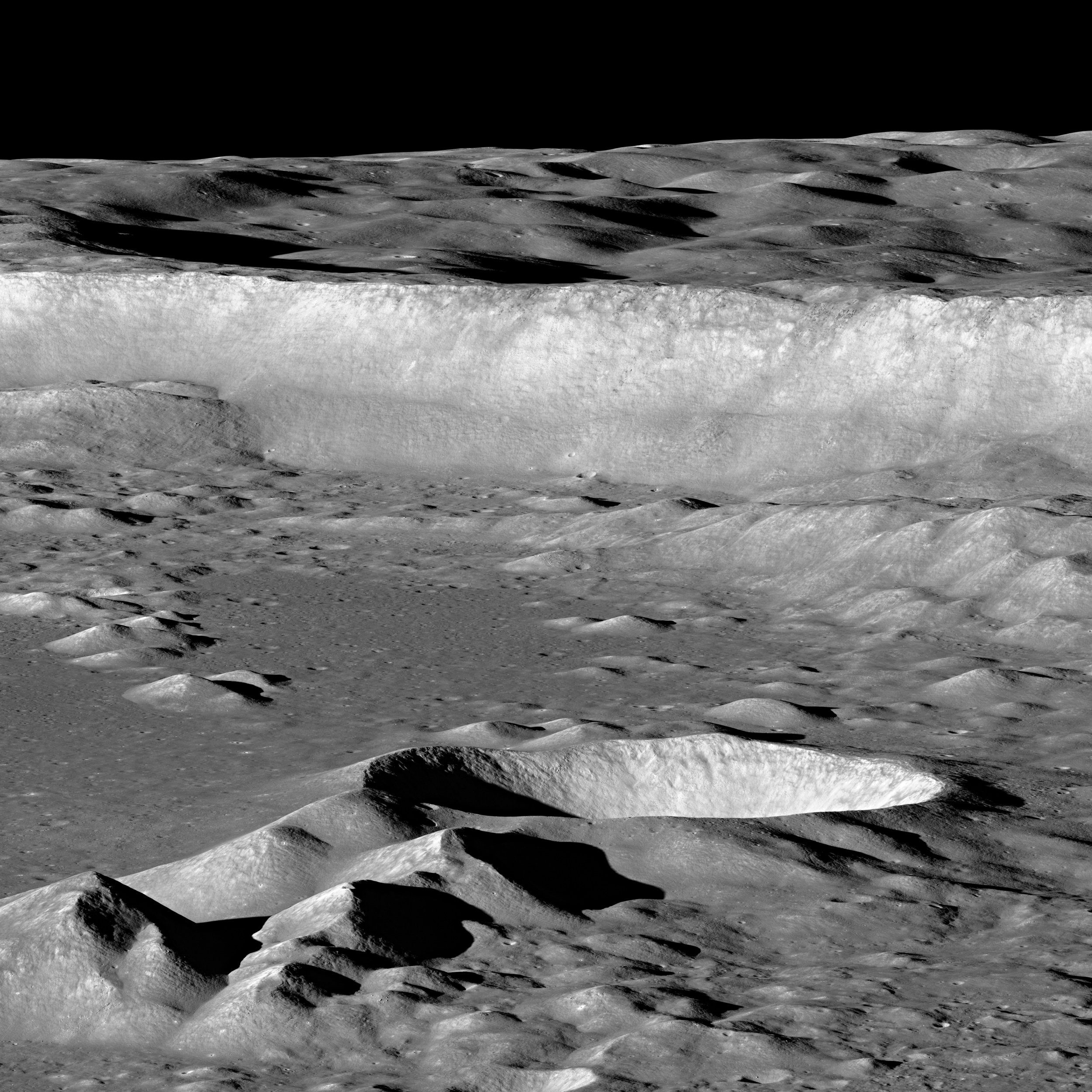 A imagem de cima foi captada recentemente pela sonda Lunar Reconnaissance Orbiter e mostra parte do anel de picos de Antoniadi, enquadrado com a vertente leste da cratera, uma impressionante muralha com 4 mil metros de altura. Junto ao anel de picos podemos ver uma outra cratera, com aproximadamente 12 km de diâmetro. Esta estrutura é relativamente recente e contém no seu interior o local mais profundo da Lua, um ponto situado mais de 9 km abaixo do raio médio lunar.