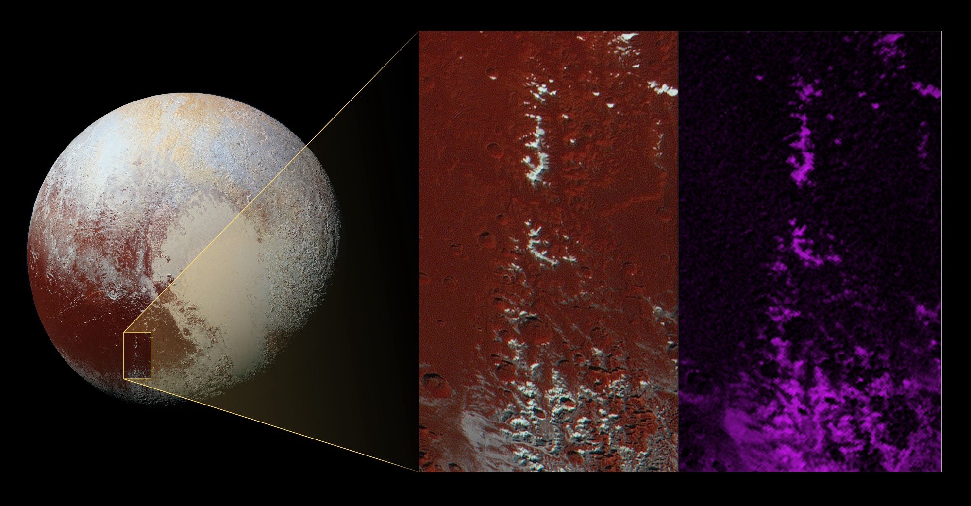 Os dados recolhidos pelo instrumento Ralph/Multispectral Visible Imaging Camera (MVIC), a bordo da New Horizons, mostram que a distribuição de metano na região (cor púrpura na imagem da direita) coincide de forma muito precisa com a neve nos topos dos picos (imagem do centro). A tonalidade castanha do terreno circundante é provavelmente devida à concentração de hidrocarbonetos complexos designados por tolinas.