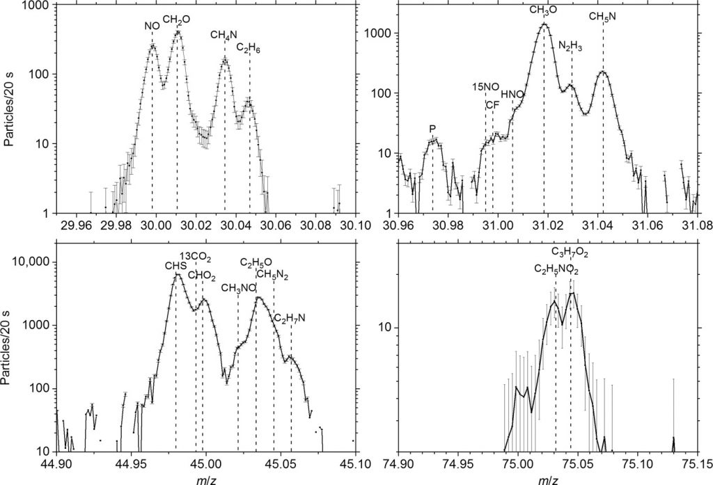 Espetros de massa de alguns dos compostos detetados pelo instrumento ROSINA, a 9 de julho de 2015. No gráfico inferior direito podemos ver o pico correspondente à glicina (C2H5NO2).