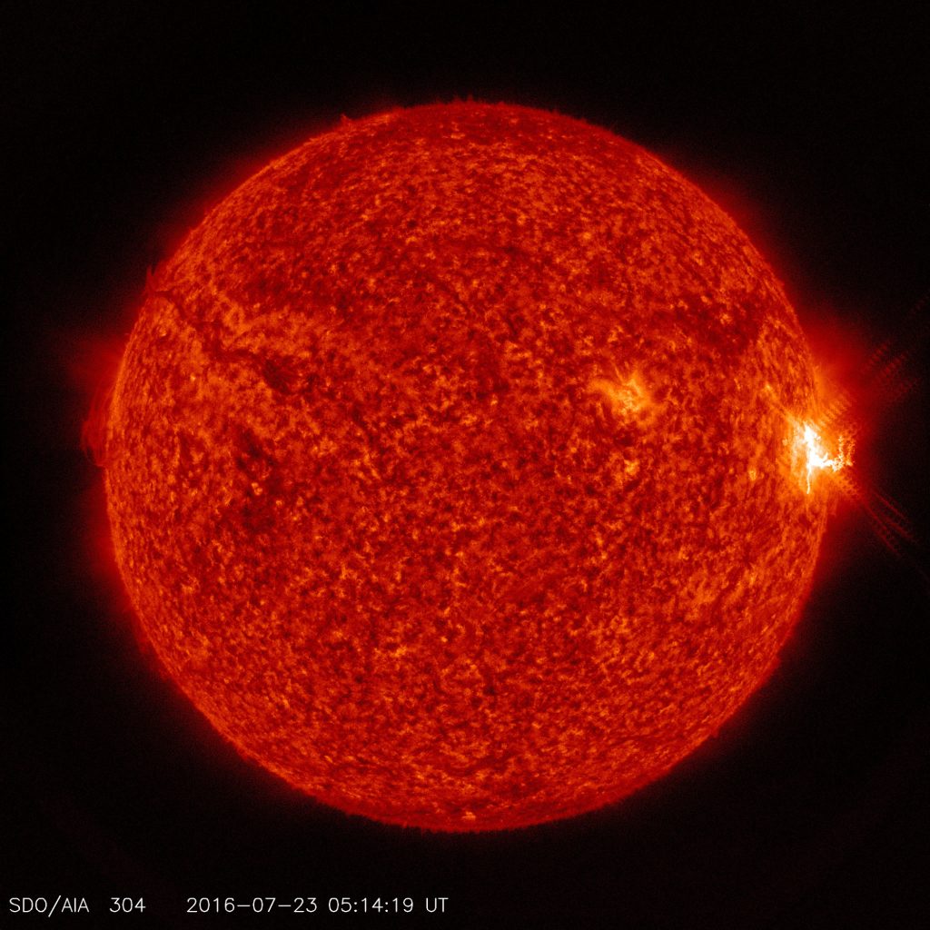A segunda de três fulgurações classe-M produzidas pelo Sol a 23 de julho de 2016. A imagem foi obtida pelo instrumento Atmospheric Imaging Assembly do Solar Dynamics Observatory da NASA, através de um filtro na banda do ultravioleta extremo (304 Å).