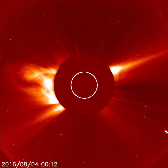 Últimos momentos da vida de um cometa numa sequência de imagens obtidas a 04 de agosto de 2016 pelo coronógrafo LASCO C2 do observatório espacial SOHO. O círculo branco representa os limites do disco solar.