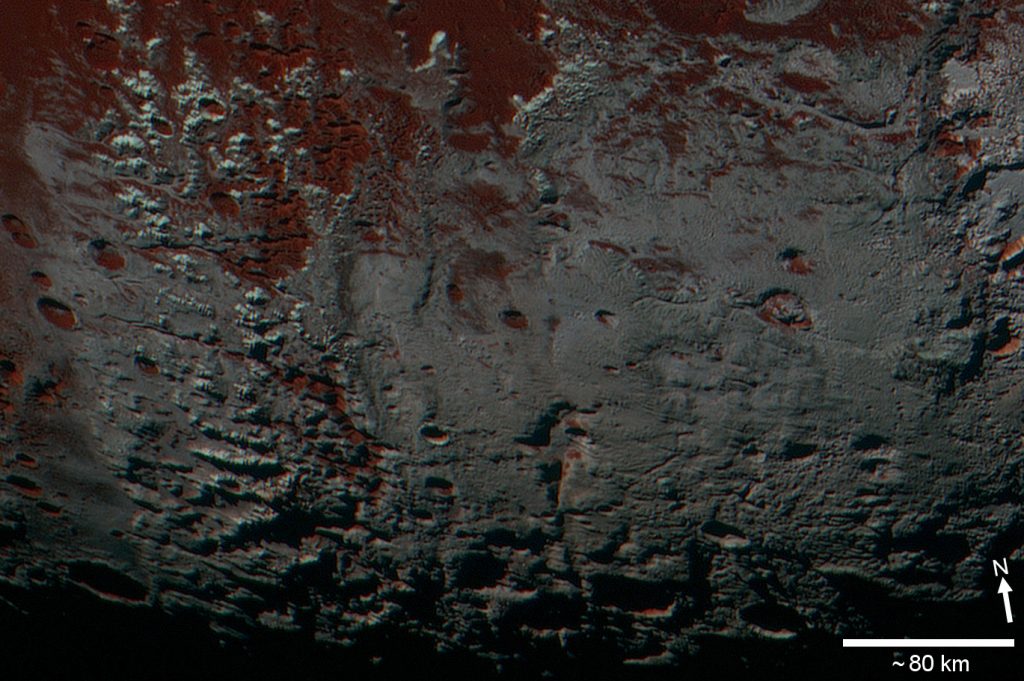 Os terrenos visíveis na imagem de cima albergam um possível vislumbre do que poderá esconder-se nas regiões do hemisfério sul de Plutão, que se encontravam envoltas pela longa escuridão hibernal durante a visita da New Horizons, em julho de 2015.