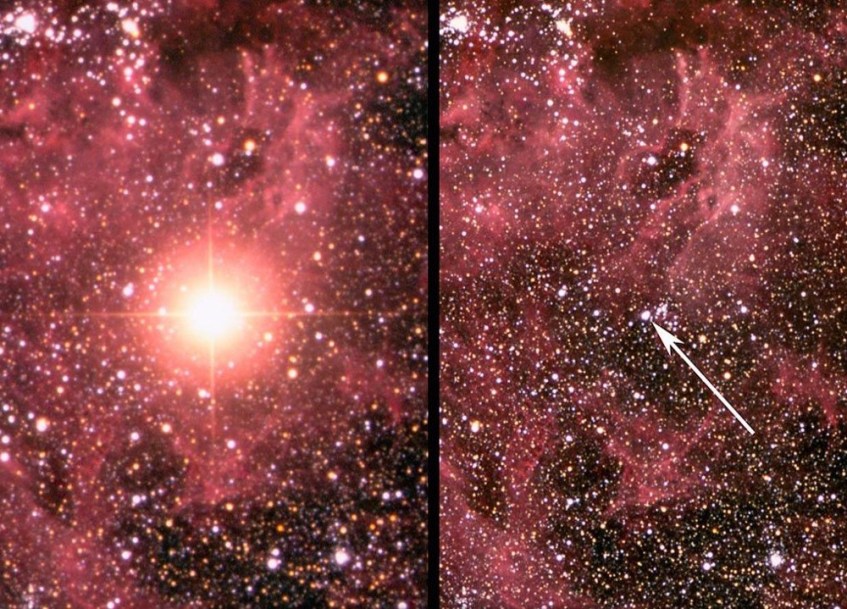A supernova 1987A (à esquerda) e a sua estrela progenitora (à direita, seta), Sanduleak -69º202, fotografada anos antes da explosão.