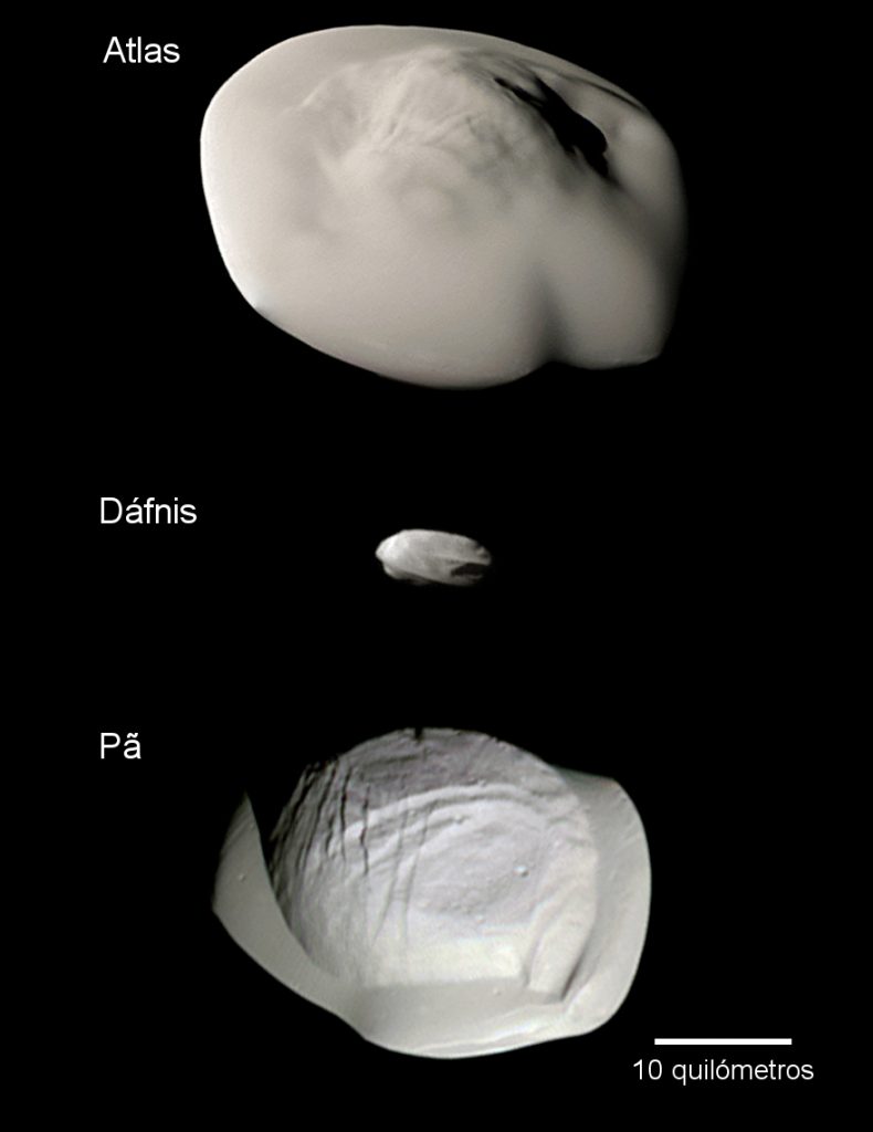 Atlas, Dáfnis e Pã numa montagem de imagens recentemente obtidas pela sonda Cassini.