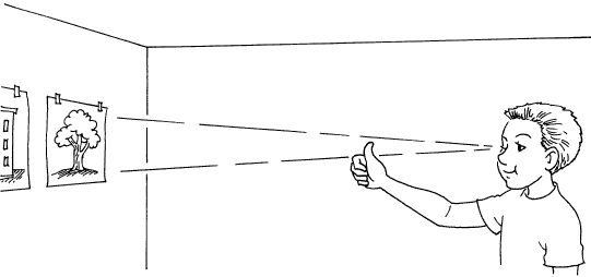 O método mais simples e directo para a medição da distância de uma estrela é designado de Método do Paralaxe. De forma muito resumida, trata-se apenas de medir um ângulo no céu — o ângulo de paralaxe — que depois é facilmente convertido na distância da estrela através de uma fórmula trivial. Baseia-se numa observação muito simples: um objecto próximo de nós parece mover-se relativamente a objectos mais distantes quando observado a partir de duas posições diferentes. Por exemplo, na Figura 1 o rapaz coloca o dedo polegar à distância de um braço estendido e observa-o alternadamente com cada olho (o outro olho deve estar fechado). Se fechar o olho esquerdo, observando com o direito, vê o dedo numa posição; se fechar o olho direito, observando com o esquerdo, o objecto parece mover-se relativamente aos quadros na parede. O deslocamento aparente é inversamente proporcional à distância, isto é, objectos mais próximos apresentam um deslocamento maior. Medindo o ângulo correspondente ao deslocamento aparente do objecto e sabendo a distância entre os dois olhos, podemos calcular facilmente a que distância se encontra o dedo.