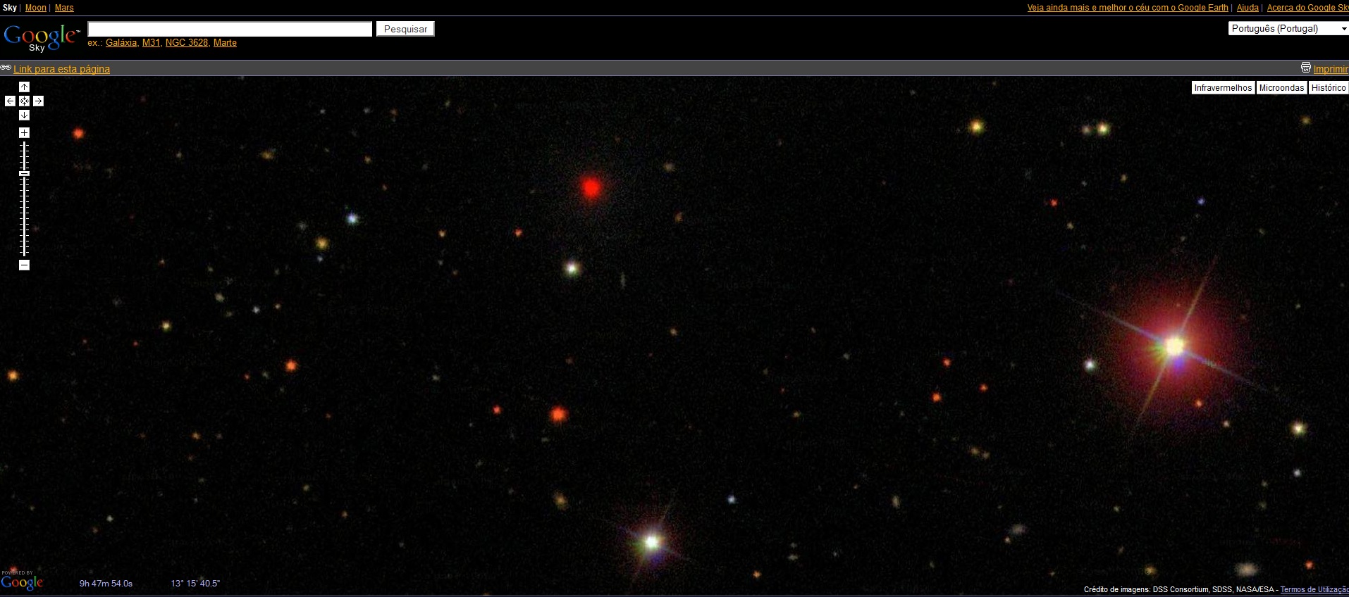 Temos recebido vários comentários a perguntarem o que é um determinado objecto no Google Sky. Isso é excelente dos comentadores: não sabem, por isso perguntam. Isso denota literacia funcional. Normalmente esse objecto está em 13º 15′ 40.8” —— 9h 47 m 54 s Como parece não existir no visível, mas existe no infravermelho, então imagina-se …